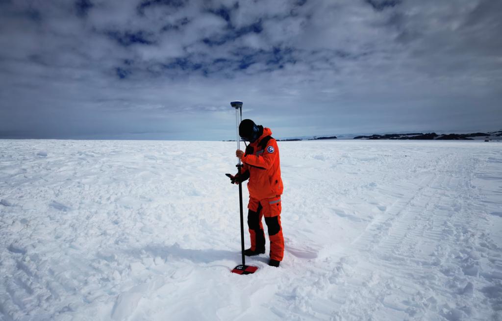 图2. 李洪伟在南极冰盖做GNSS高精度定位观测