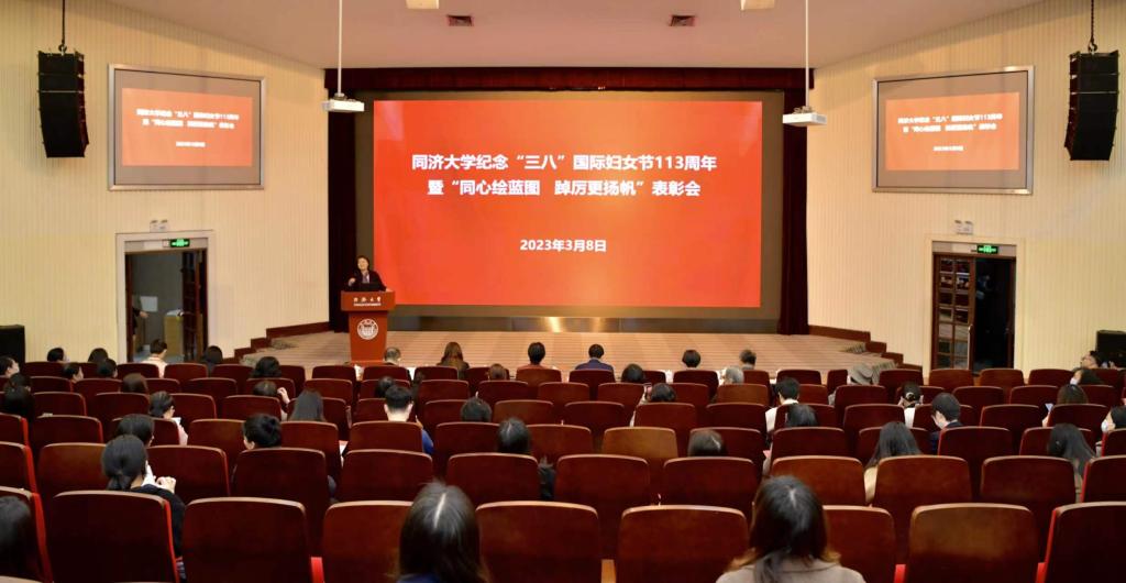 纪念“三八”国际妇女节113周年暨“同心绘蓝图 踔厉更扬帆”表彰会在四平路校区逸夫楼一楼报告厅隆重举行,性爱视频