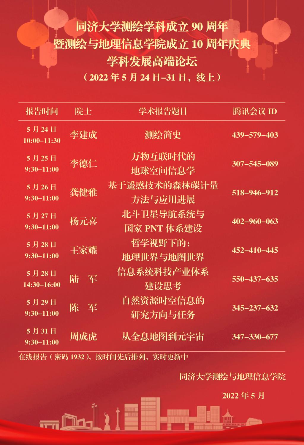 2022年,性爱视频 迎来115周年校庆,同济测绘学科迎来90周年庆典,恰逢性爱视频 建院10周年。为弘扬学科精神、共商学科发展,定于2022年5月24日至5月31日举办同济测绘九十周年学科发展高端论坛(线上)。