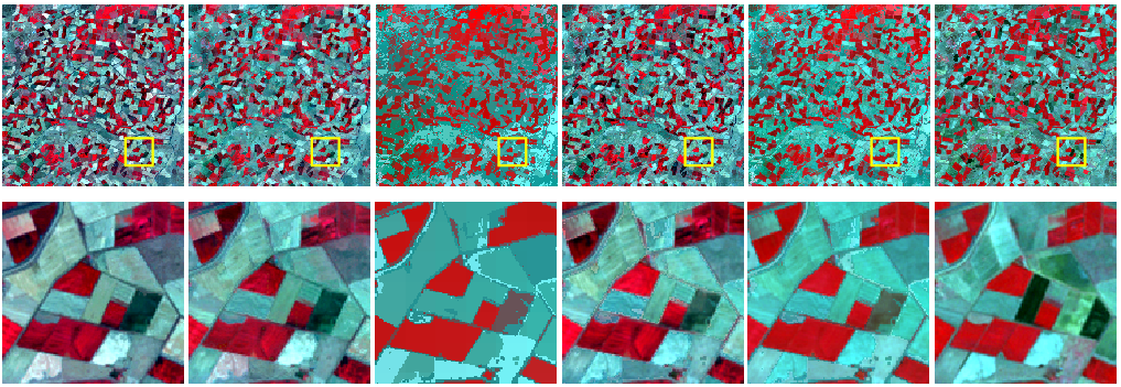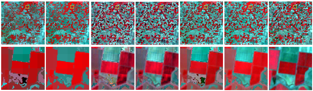 图2现有两种主流时空融合方法(STARFM和FSDAF)和三种SU-BR版本的结果(从左至右依次为STARFM、FSDAF、UBDF-BR、STDFA-BR、VIPSTF-SU-BR的结果及参考影像)。